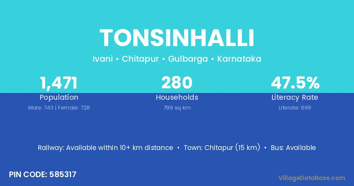 Chitapur (15 km) is the nearest town to Tonsinhalli village for major economic activities and is located approximately 15 km away.
