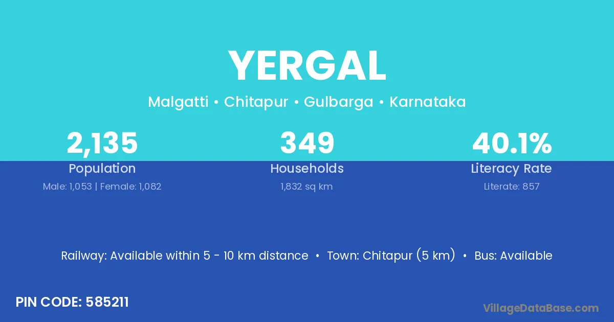 Chitapur (5 km) is the nearest town to Yergal village for major economic activities and is located approximately 5 km away.