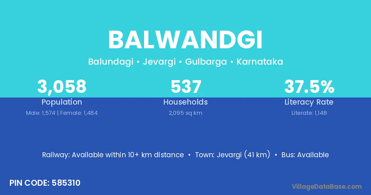 Jevargi (41 km) is the nearest town to Balwandgi village for major economic activities and is located approximately 41 km away.