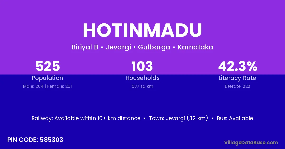 Jevargi (32 km) is the nearest town to Hotinmadu village for major economic activities and is located approximately 32 km away.