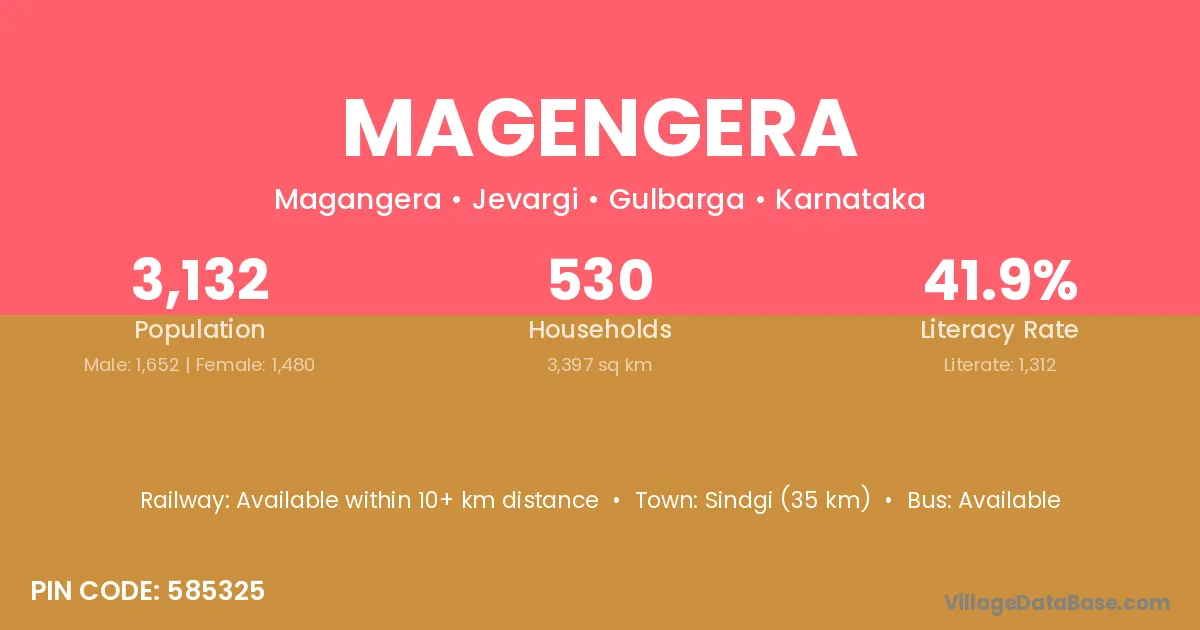 Sindgi (35 km) is the nearest town to Magengera village for major economic activities and is located approximately 35 km away.
