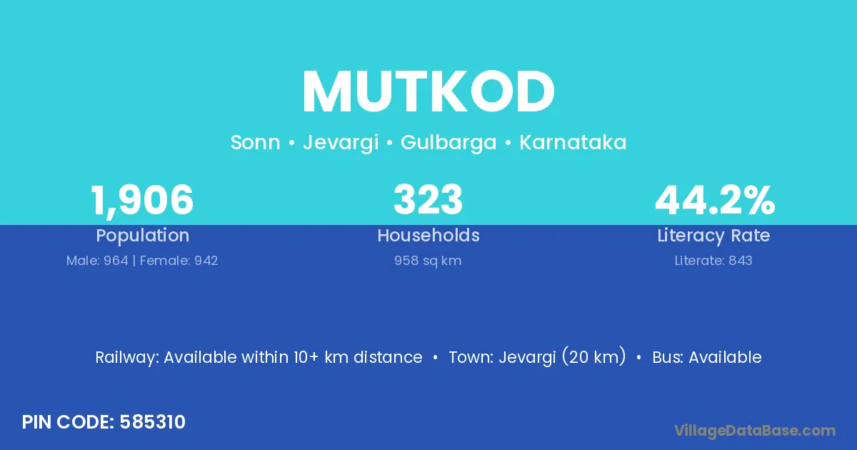 Jevargi (20 km) is the nearest town to Mutkod village for major economic activities and is located approximately 20 km away.