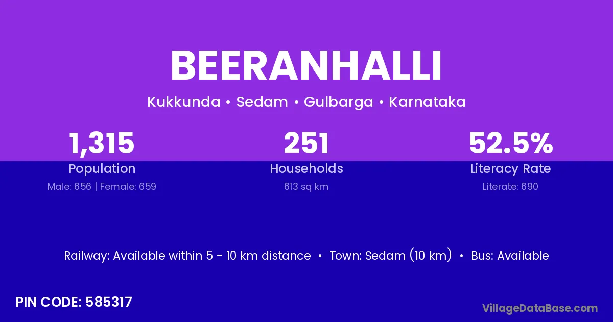 Beeranhalli village has a total population of 1,315 people, of which 656 are males and 659 are females.