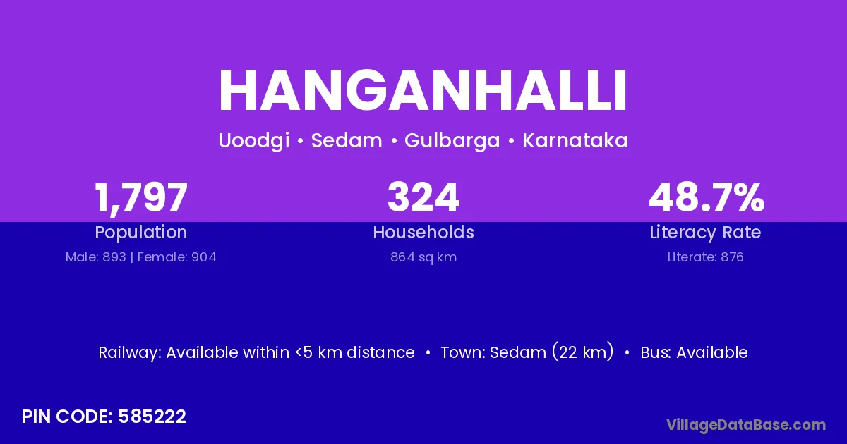 Sedam (22 km) is the nearest town to Hanganhalli village for major economic activities and is located approximately 22 km away.