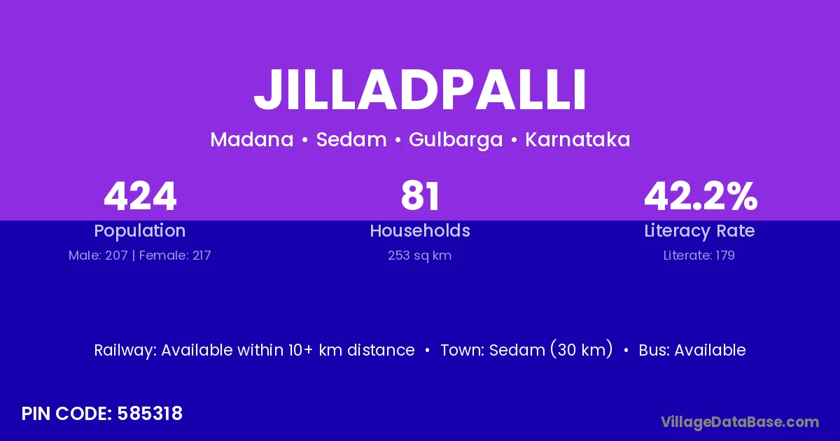 Jilladpalli village has a total population of 424 people, of which 207 are males and 217 are females.
