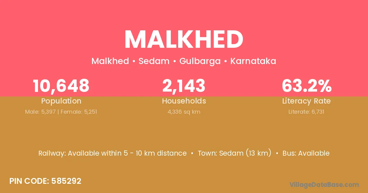 Sedam (13 km) is the nearest town to Malkhed village for major economic activities and is located approximately 13 km away.
