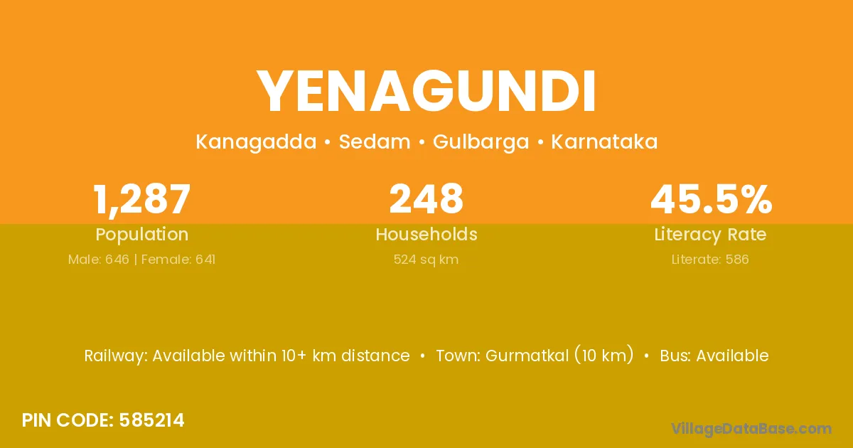 Gurmatkal (10 km) is the nearest town to Yenagundi village for major economic activities and is located approximately 10 km away.