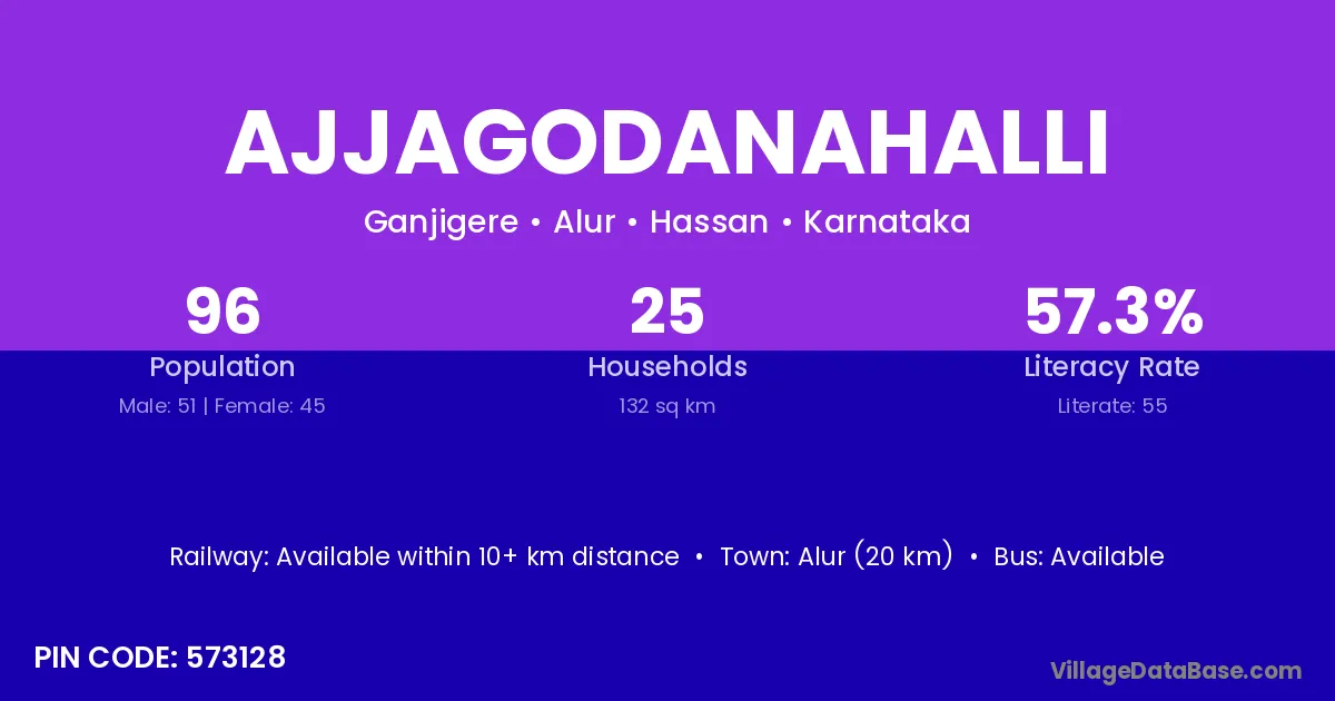 Ajjagodanahalli village has a total population of 96 people, of which 51 are males and 45 are females.