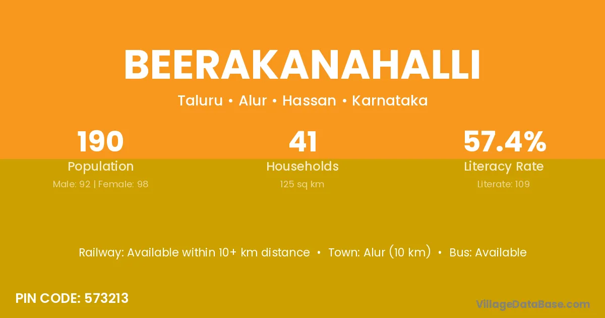 Beerakanahalli village has a total population of 190 people, of which 92 are males and 98 are females.