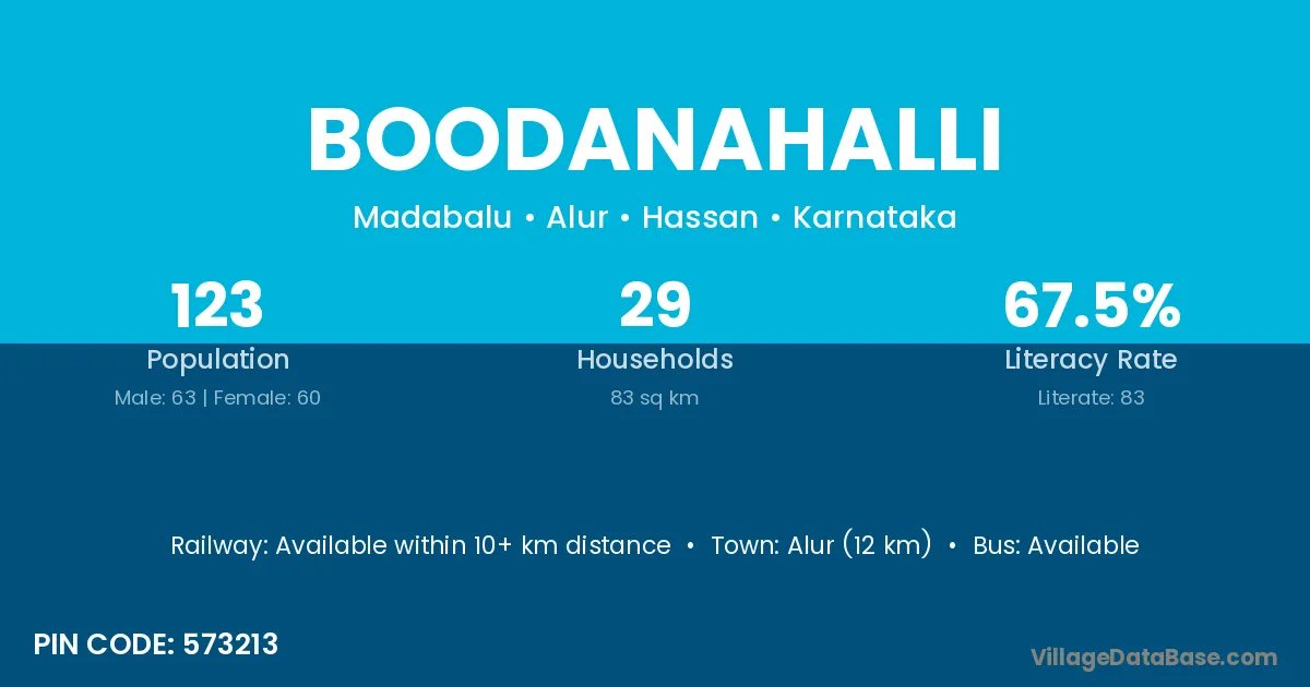 Boodanahalli village has a total population of 123 people, of which 63 are males and 60 are females.