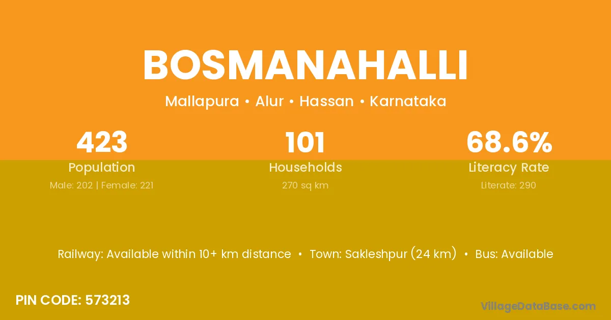 Sakleshpur (24 km) is the nearest town to Bosmanahalli village for major economic activities and is located approximately 24 km away.
