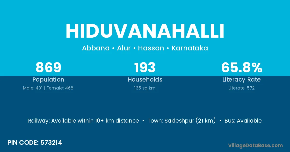 Sakleshpur (21 km) is the nearest town to Hiduvanahalli village for major economic activities and is located approximately 21 km away.