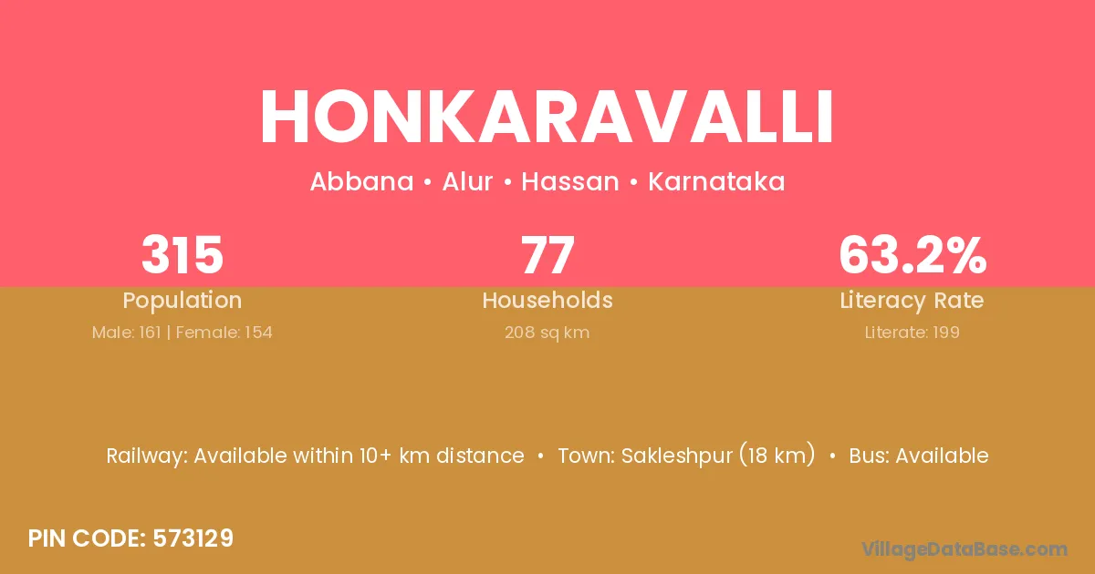 Sakleshpur (18 km) is the nearest town to Honkaravalli village for major economic activities and is located approximately 18 km away.