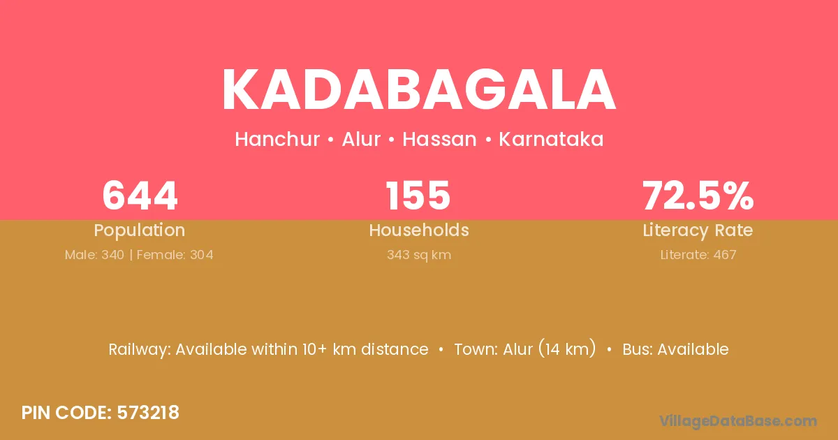Kadabagala village has a total population of 644 people, of which 340 are males and 304 are females.