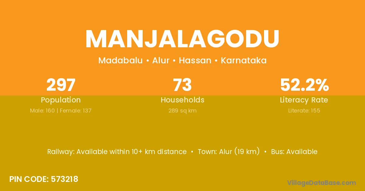 Manjalagodu village has a total population of 297 people, of which 160 are males and 137 are females.