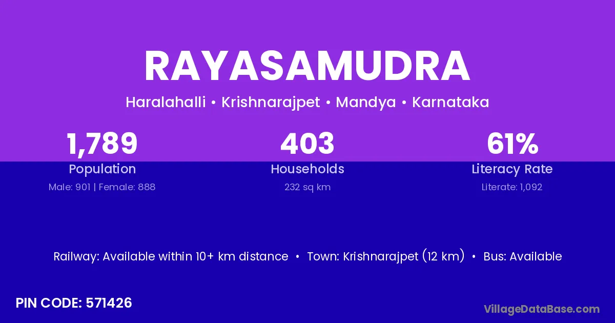 According to Census 2011 information, the village code of Rayasamudra village is 573213.