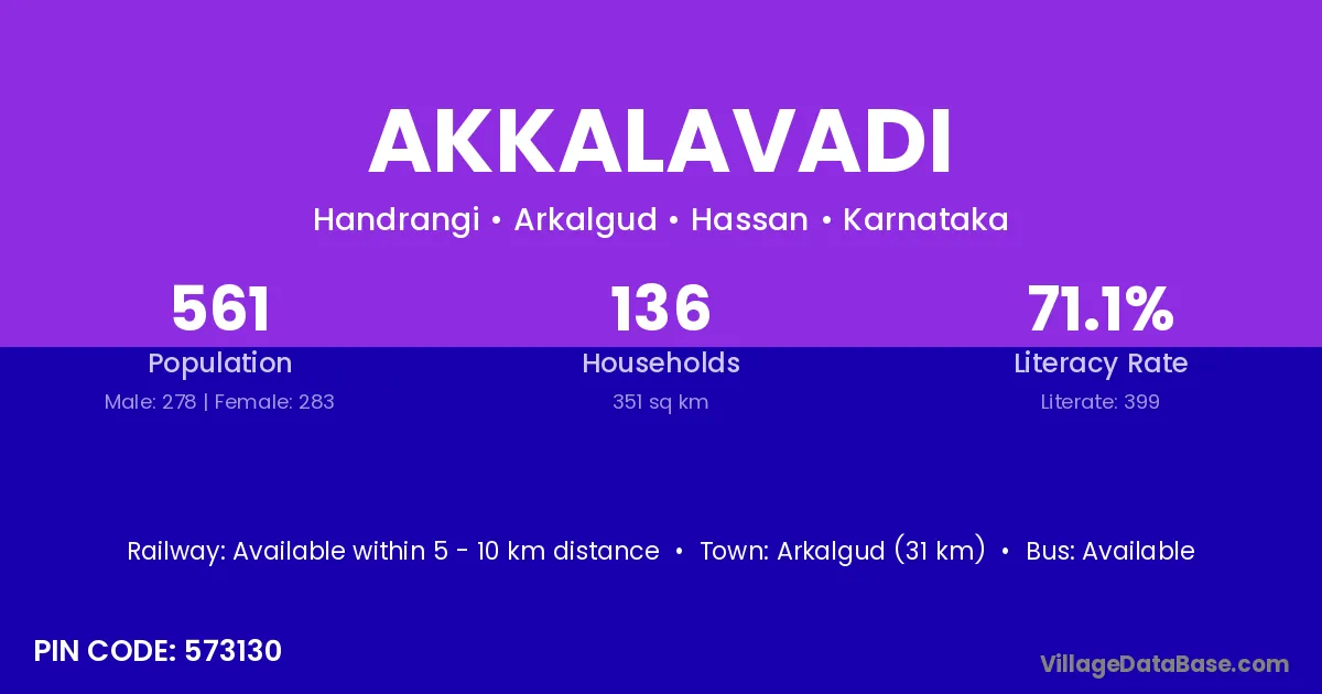 Arkalgud (31 km) is the nearest town to Akkalavadi village for major economic activities and is located approximately 31 km away.