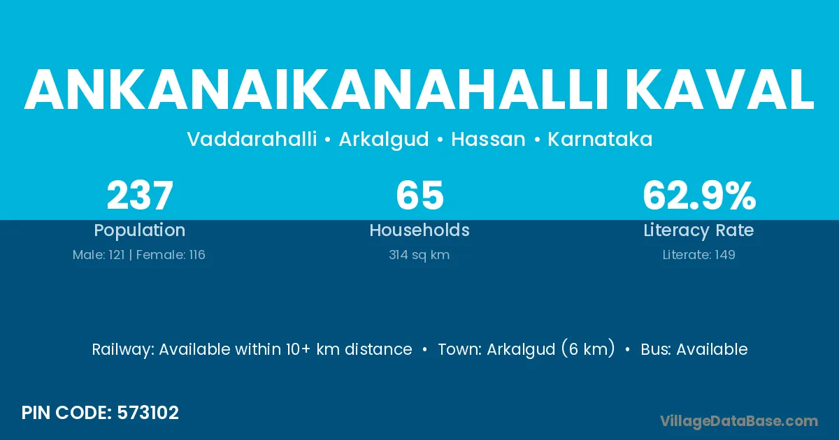 Ankanaikanahalli Kaval village has a total population of 237 people, of which 121 are males and 116 are females.