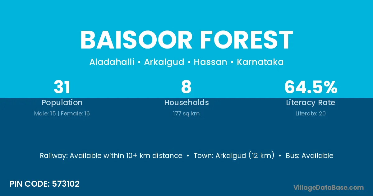 Arkalgud (12 km) is the nearest town to Baisoor Forest village for major economic activities and is located approximately 12 km away.
