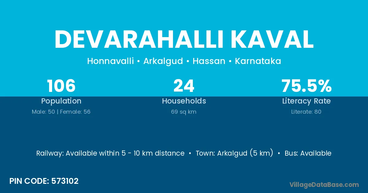 Devarahalli Kaval village has a total population of 106 people, of which 50 are males and 56 are females.