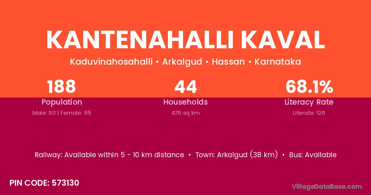 Kantenahalli Kaval village has a total population of 188 people, of which 93 are males and 95 are females.
