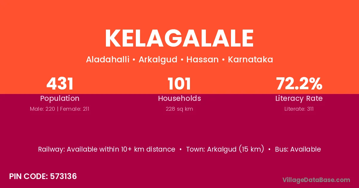 Kelagalale village has a total population of 431 people, of which 220 are males and 211 are females.