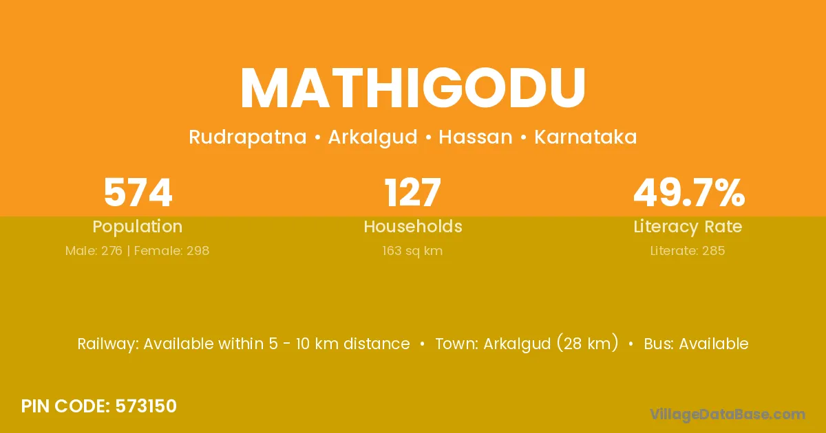Arkalgud (28 km) is the nearest town to Mathigodu village for major economic activities and is located approximately 28 km away.