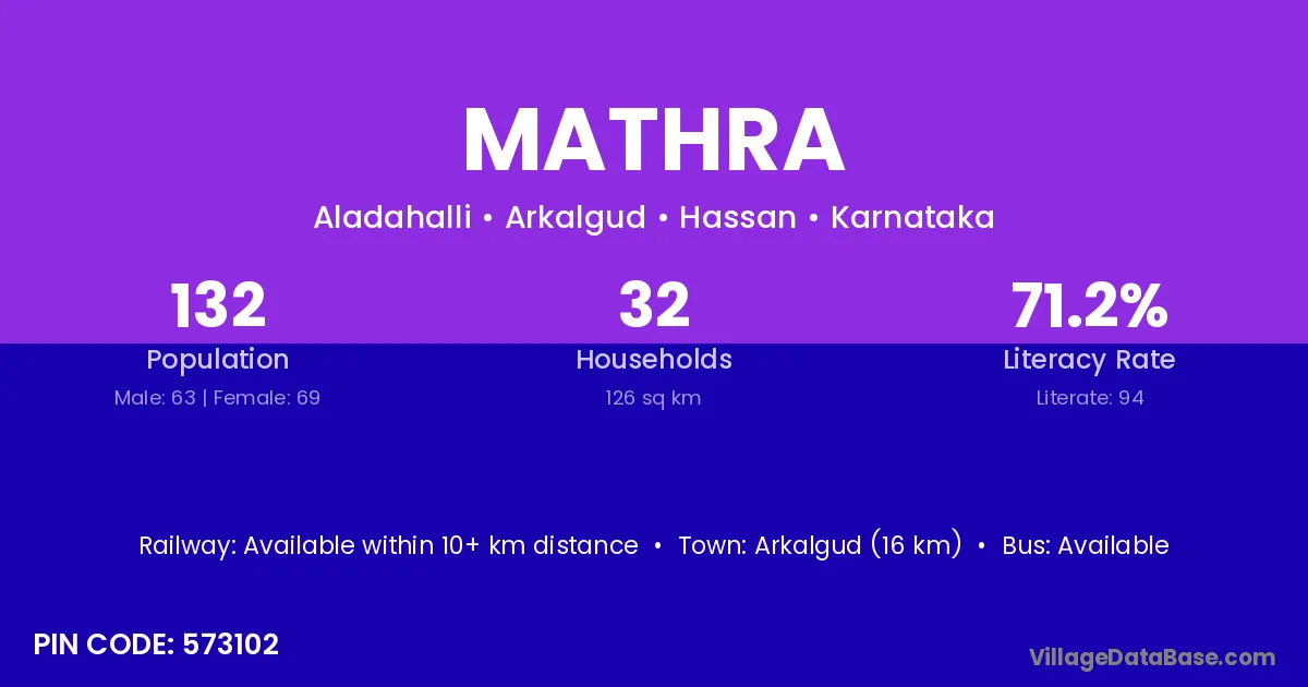 Arkalgud (16 km) is the nearest town to Mathra village for major economic activities and is located approximately 16 km away.