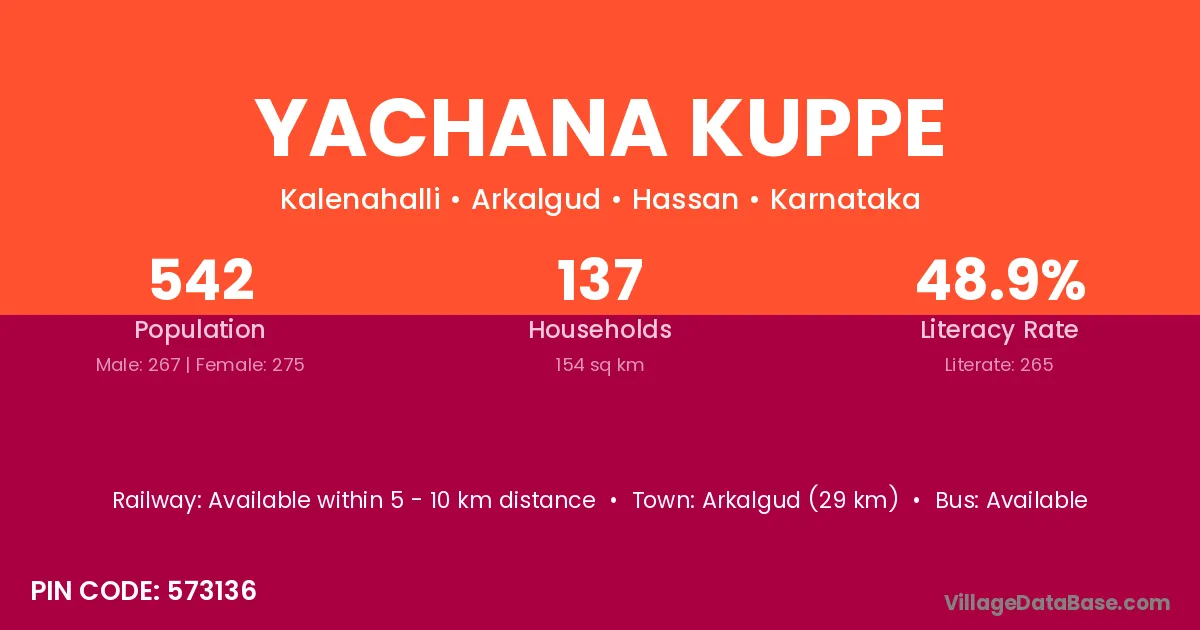 Yachana Kuppe village has a total population of 542 people, of which 267 are males and 275 are females.