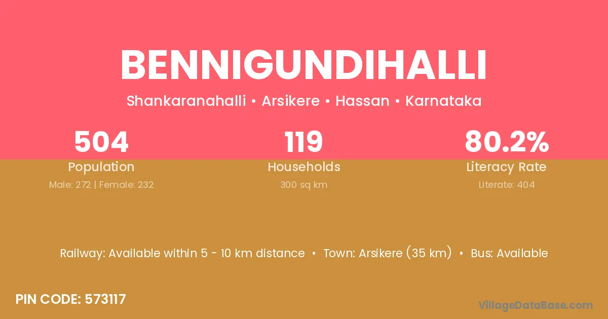 Bennigundihalli village has a total population of 504 people, of which 272 are males and 232 are females.