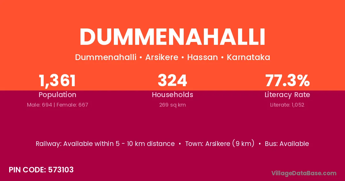 Arsikere (9 km) is the nearest town to Dummenahalli village for major economic activities and is located approximately 9 km away.
