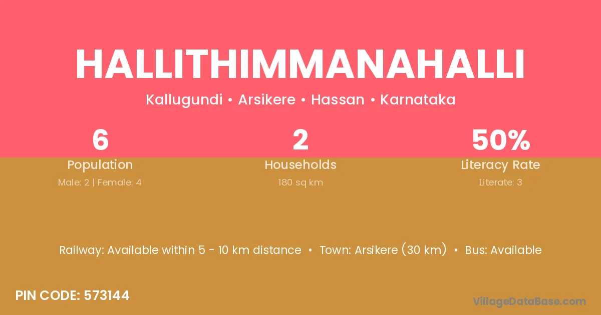 Arsikere (30 km) is the nearest town to Hallithimmanahalli village for major economic activities and is located approximately 30 km away.