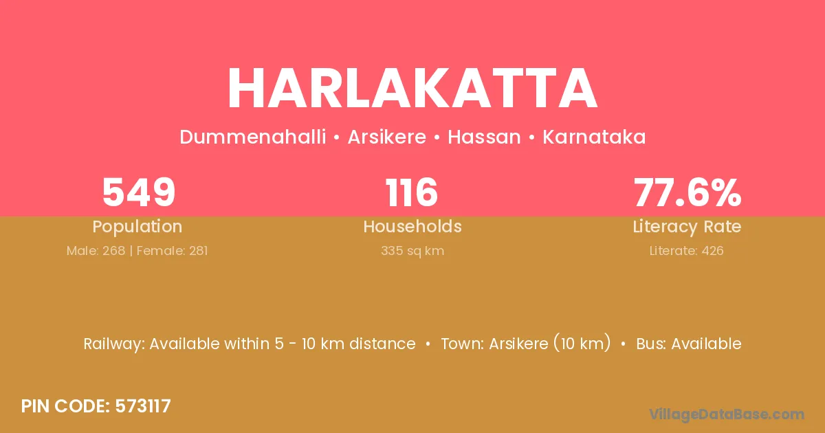 Arsikere (10 km) is the nearest town to Harlakatta village for major economic activities and is located approximately 10 km away.