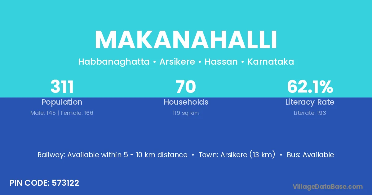 Arsikere (13 km) is the nearest town to Makanahalli village for major economic activities and is located approximately 13 km away.