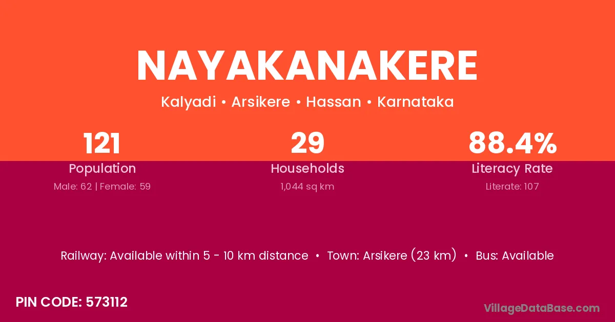 Arsikere (23 km) is the nearest town to Nayakanakere village for major economic activities and is located approximately 23 km away.