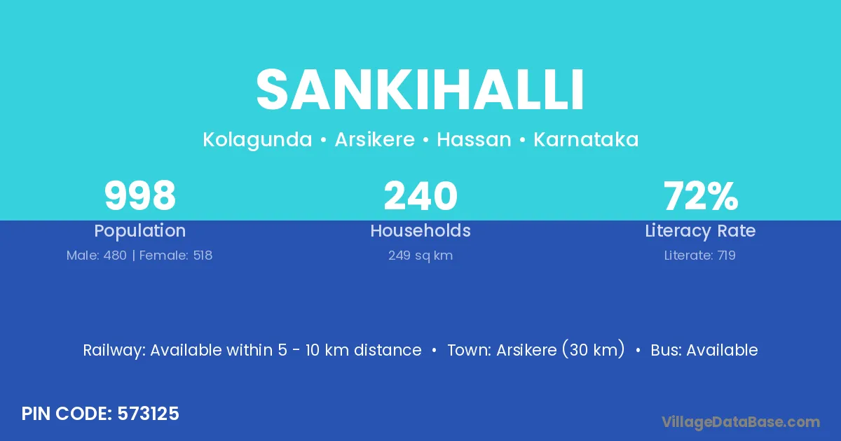 Sankihalli village has a total population of 998 people, of which 480 are males and 518 are females.