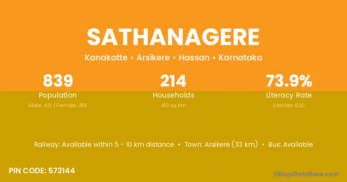 Sathanagere village has a total population of 839 people, of which 421 are males and 418 are females.