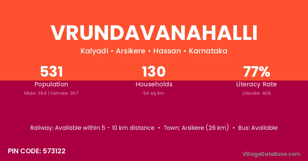 Vrundavanahalli village has a total population of 531 people, of which 264 are males and 267 are females.