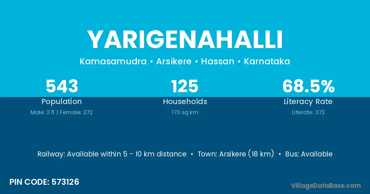 Arsikere (18 km) is the nearest town to Yarigenahalli village for major economic activities and is located approximately 18 km away.