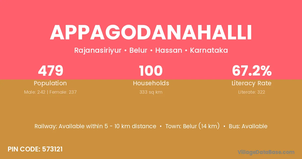Appagodanahalli village has a total population of 479 people, of which 242 are males and 237 are females.