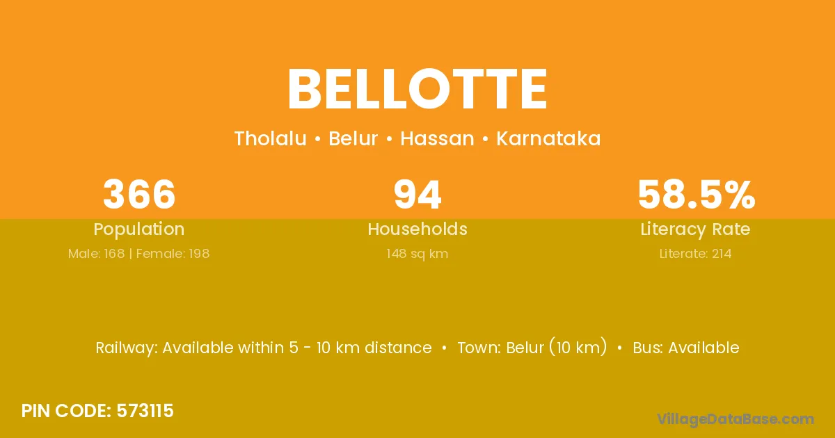 Belur (10 km) is the nearest town to Bellotte village for major economic activities and is located approximately 10 km away.