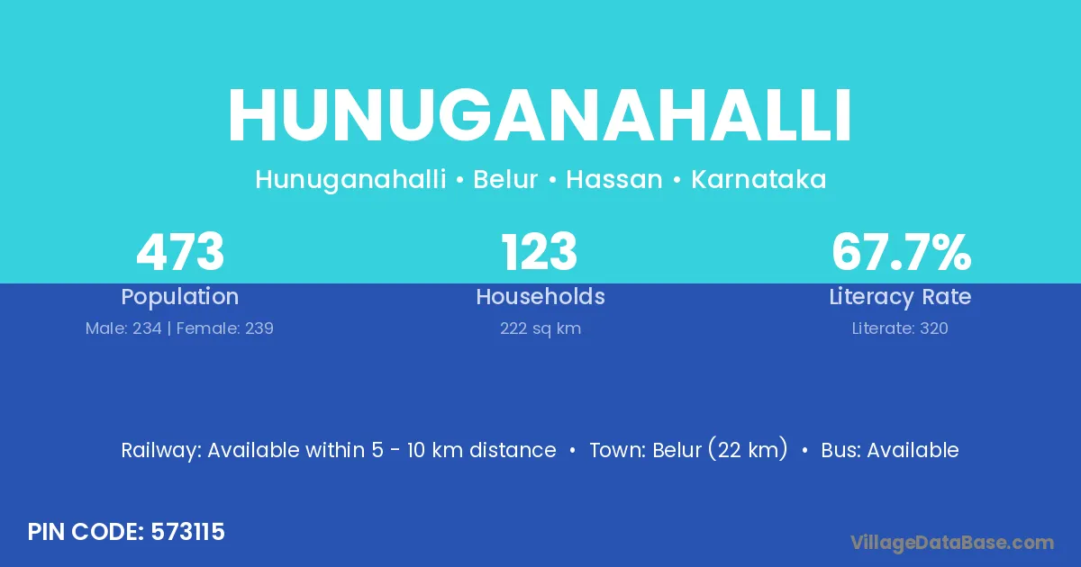 Belur (22 km) is the nearest town to Hunuganahalli village for major economic activities and is located approximately 22 km away.