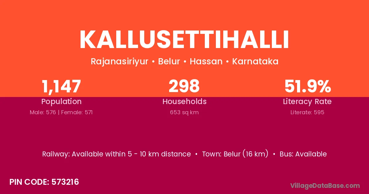 Belur (16 km) is the nearest town to Kallusettihalli village for major economic activities and is located approximately 16 km away.