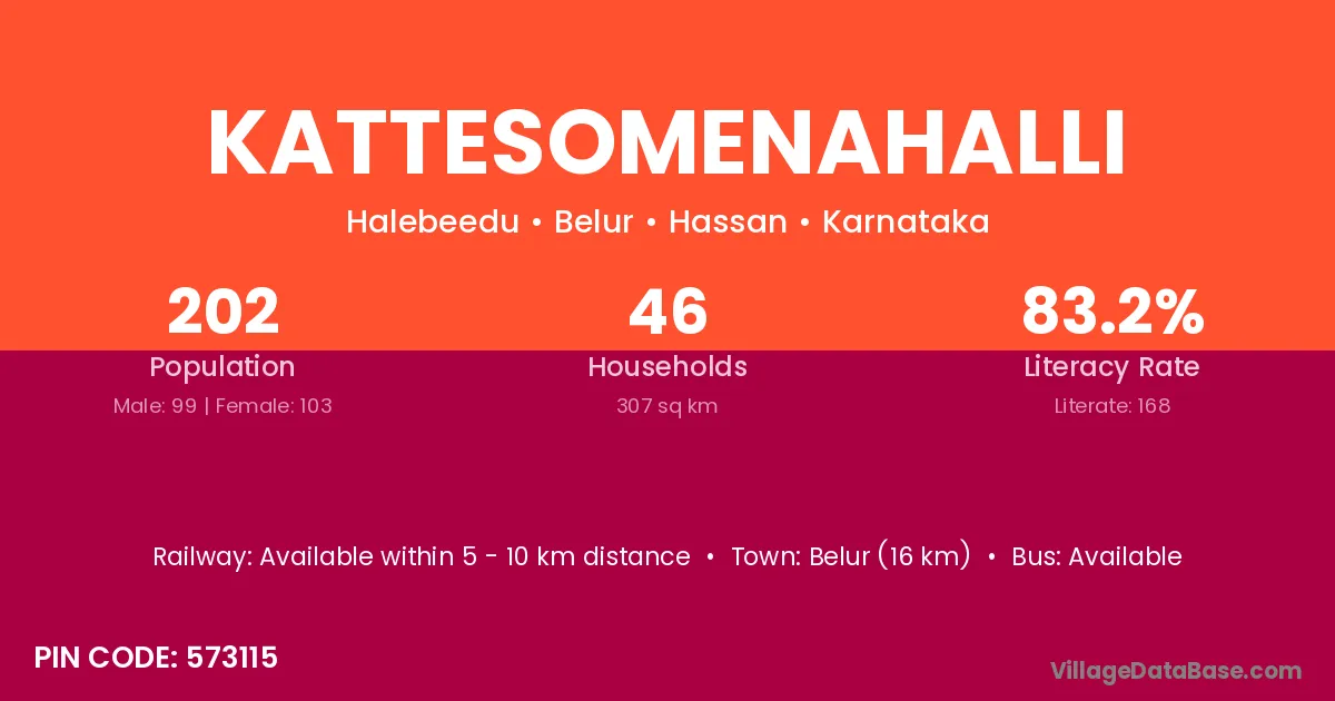 Belur (16 km) is the nearest town to Kattesomenahalli village for major economic activities and is located approximately 16 km away.