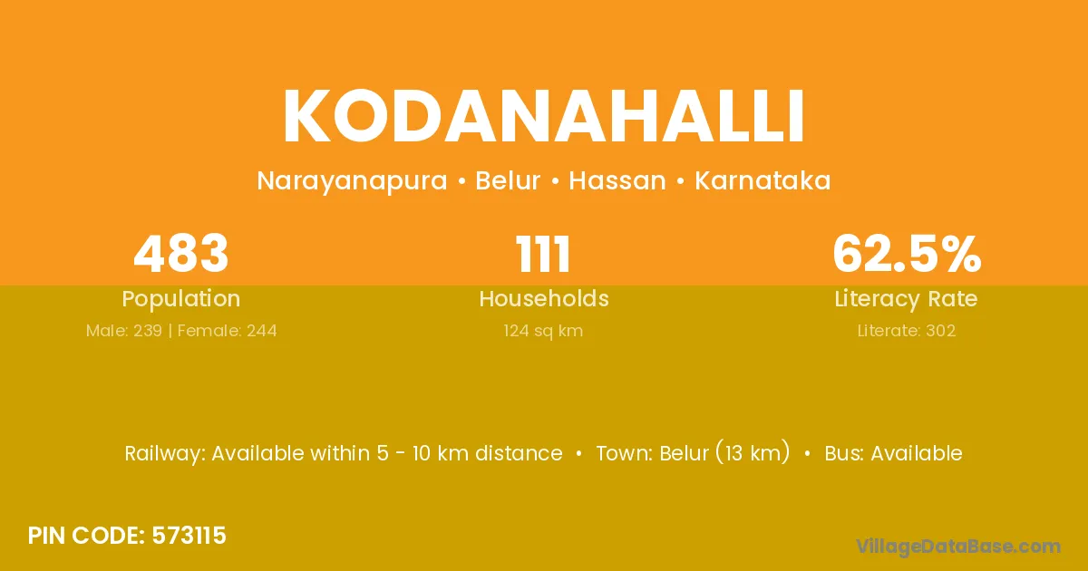Belur (13 km) is the nearest town to Kodanahalli village for major economic activities and is located approximately 13 km away.