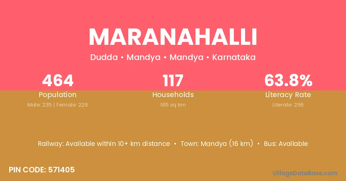 Maranahalli village has a total population of 185 people, of which 99 are males and 86 are females.
