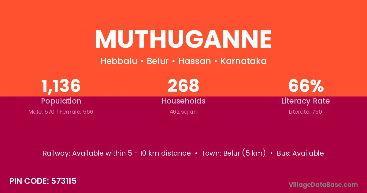 Muthuganne village has a total population of 1,136 people, of which 570 are males and 566 are females.