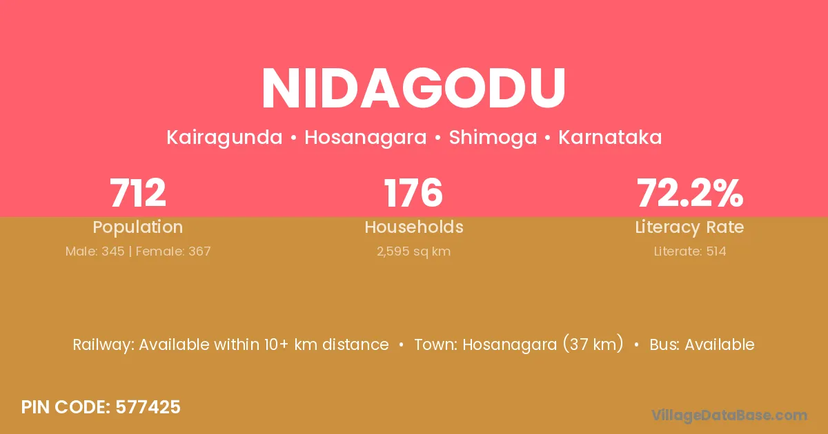 The literacy rate of Nidagodu village is 84.78%. Male literacy stands at 94.44% and female literacy at 75.53%.