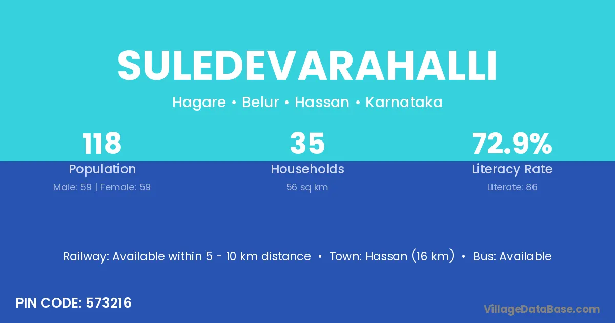 Hassan (16 km) is the nearest town to Suledevarahalli village for major economic activities and is located approximately 16 km away.