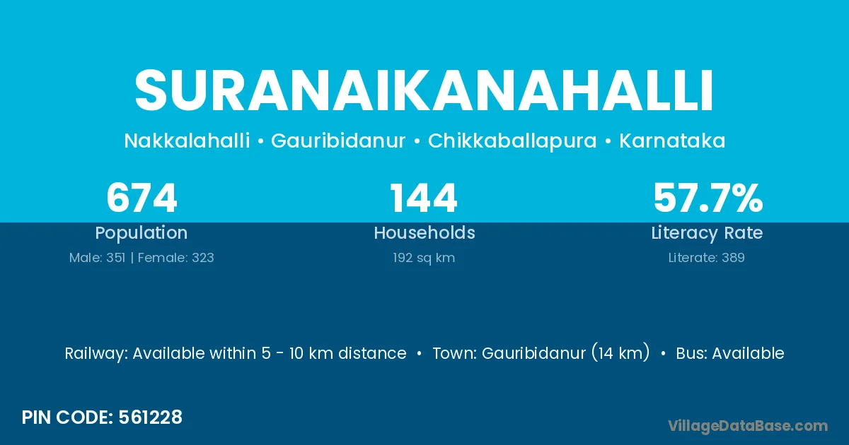 The literacy rate of Suranaikanahalli village is 73.25%. Male literacy stands at 81.59% and female literacy at 64.18%.